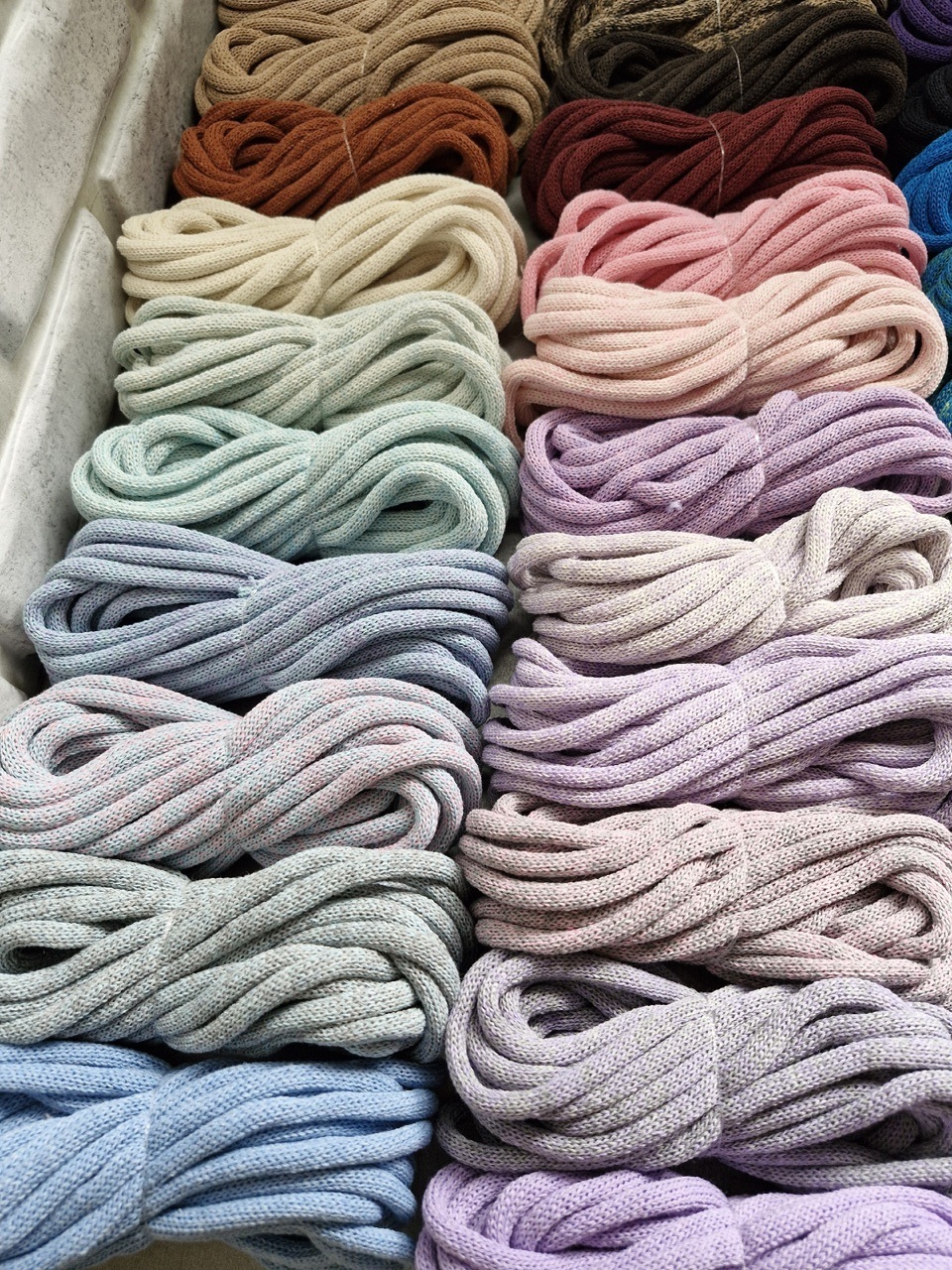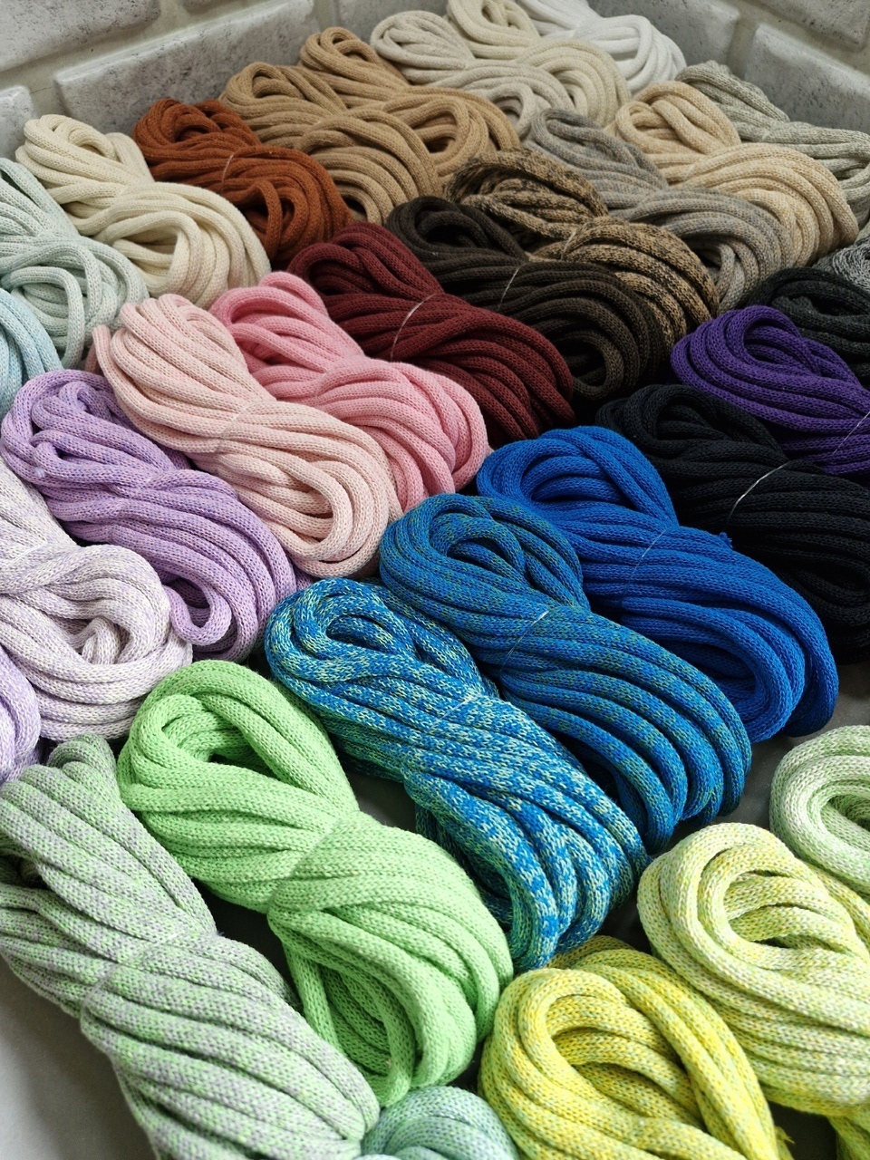 Наш сайт предлагает рукодельницам широкий выбор полиэфирных, хлопковых и акриловых шнуров отличного качества для вязания ковров, корзин и других изделий, плетения гамаков и макраме. Область применения шнуров и веревочных изделий очень широка. Изделия из полиэфирного шнура красивы и прочны, не теряют форму и цвет, износоустойчивы и легко стираются. В последнее время ковры ручной работы пользуются все большим спросом.